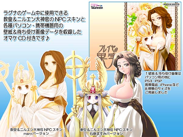 フレイヤの果実ご購入者様にプレゼント!の、おまけCD 「フレイヤの果実 Extra CD」 これは上記の『フレイヤの果実』を ご購入下さいました方に プレゼントさせていただくおまけCDです。 ●教皇様とニルエン大神官様のNPC画像用スキン (ますみバージョンとmaryさんバージョンの2種類) ●表紙イラストを元にした PCデスクトップ壁紙や携帯待ち受け画像 が、収録されております!!(*´▽`*) |